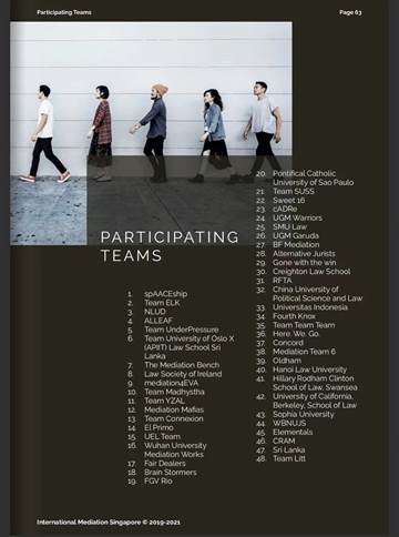 (通讯员 庄可)2021年10月22日至10月31日,为期两周的第三届新加坡国际商事调解比赛在线上成功进行,其中比赛第一周为2021年10月22日至24日,而比赛第二周则在2021年10月30日至31日开展。本次比赛的主要组织者为新加坡国际调解协会(Singapore International Mediation Institute)、合作性争端解决协会(Collaborative Dispute Resolution Club)、调解者咨询服务机构(Peacemakers Consulting Services)。新加坡国际争端解决协会(Singapore International Dispute Resolution Academy)、新加坡国际调解中心(Singapore International Mediation Center)、新加坡调解中心(Singapore Mediation Center)三个协会组织也对本场比赛的成功举办提供了诸多支持。本次比赛吸引了分别来自34个不同国家和地区的400多位参赛者,共有48个比赛队伍、76位评委参加。