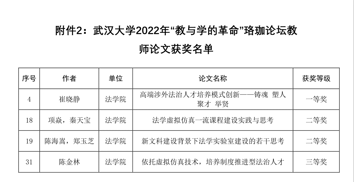 荣获“优秀组织奖”,崔晓静老师撰写的《高端涉外法治人才培养模式创新——铸魂 塑人 聚才 举贤》获得一等奖,项焱、秦天宝老师撰写的《法学虚拟仿真一流课程建设实践与思考》获得二等奖,陈海嵩、郑玉芝老师撰写的《新文科建设背景下法学实验室建设的若干思考》获得二等奖,陈金林老师撰写的《依托虚拟仿真技术,培养制度推进型法治人才》获得三等奖。