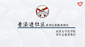 的学生,积极发挥专业优势,致力于通过支教与普法进行日常化多元化的法治教育与宣传,填补当地的普法空白,在民众心中栽下一粒法律的种子,助力法治社会建设。“普法进社区”志愿项目积极响应全面推进依法治国,建设法治社会的要求,立足社会实际,旨在对社区居民进行常态化、体系化的法律教育。在实践中,团队探索出一条“常态普法、发现问题、解决纠纷、跟进执行”的完整服务链条,数次前往珞珈山街道下辖的水生村社区、东湖村社区等社区开展预防诈骗、反对家庭暴力等主题普法活动,并寻求合作不断推广。