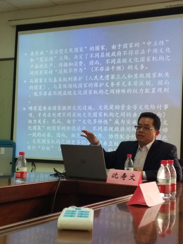 随后,沈教授论述了文化基本权利的性质,应当基于其性质制定文化国策和设置文化国家机构。文化基本权利在内容上是一把权利束,既有社会权利的内容,也有政治权利的内容。文化权利包含参加文化生活权、分享科学进步及其产生的福利权,对其本人的任何科学、文学或艺术作品所产生的精神上和物质上的利益享受保护权及进行科学研究和创造性活动所不可或缺的自由。文化权利在性质上是一种复合的权利,既有积极权利的性质,也有消极权利的性质。文化权作为一种防御权,此时人民有请求国家不要干预其文化活动、文化生活与接近文化媒体的权利;文化权作为一种受益权,此时人民有请求国家提供其文化节目之权利;文化权作为国家之保护义务,此时国家有保护文化之义务。